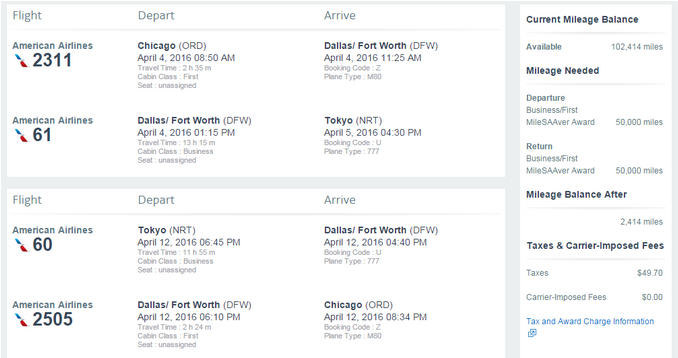 Just from the introductory bonuses, you each have 100K AA miles, 25K Starpoints, and 2 free nights at any Hyatt. You can fly from Chicago to Tokyo in business class for 100K AA miles during off-peak times (off-peak for Japan is defined as 10/1 â 4/30). I found lots of flight options when searching for 100K mile roundtrip award ticketsâhereâs one example.