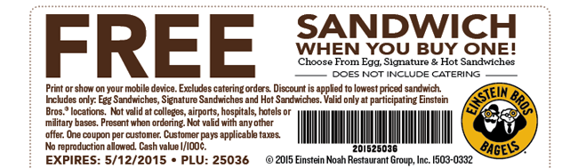 I got a coupon for BOGO breakfast sandwiches from Einstein and decided to use it this morning. If you haven’t already, sign up for their email newsletter. That’s $6 for two ridiculously good breakfast sandwiches that I spaced out over two days.