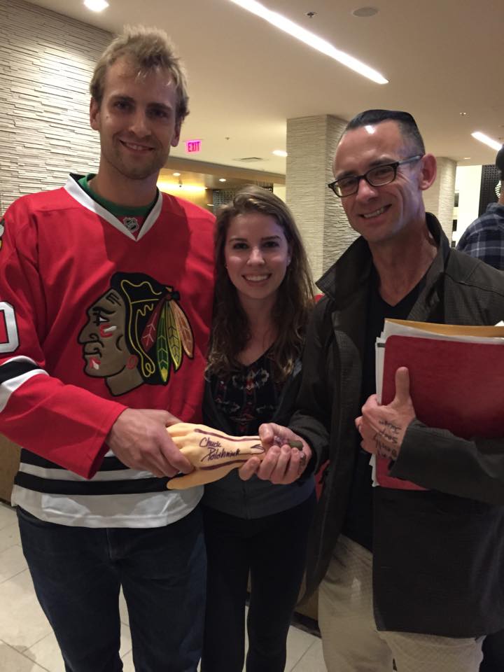 Once in Naperville, we split a cab with some other attendees of the event we were headed to. My favorite author, Chuck Palahniuk, was in town for a speaking event to promote his new book. Tickets were $40 and included signed copies of that book and the Fight Club 2 comic. It was a pretty incredible event – he read some short stories, led some fun competitions, and answered fans’ burning questions. We hung out at the hotel bar afterwards to watch the Blackhawks win. We were lucky to catch Chuck Palahniuk as he was heading out and got a picture! He answered my burning question about the ending of Survivor, but I won’t spoil it here… ๐
