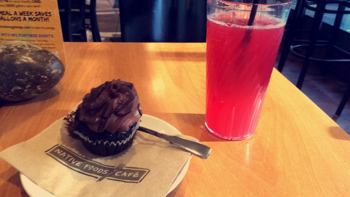 A couple weeks ago, I went to Native Foods Cafe for a focus group. In exchange for my time and opinions, they gave me a gift car to come back. Native Foods Cafe is a vegan restaurant – not what I’d usually consider my cup of tea. But when I went in for the focus group, I fell in love with their blueberry lavender lemonade. Their cupcakes are similarly amazing. The last time I was in, I had carrot cake. This time I opted for chocolate ganache. I can’t decide which one I like better.